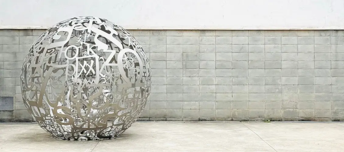 Positioned at the gallery’s entrance, Self Portrait V establishes a link between the internal exhibition space and the outside world. In this stainless steel sculpture, a human figure is enclosed within a sphere of letters, creating a metaphysical universe that represents the cosmos and the multitude of worlds and words that can emerge from a single sequence of letters.