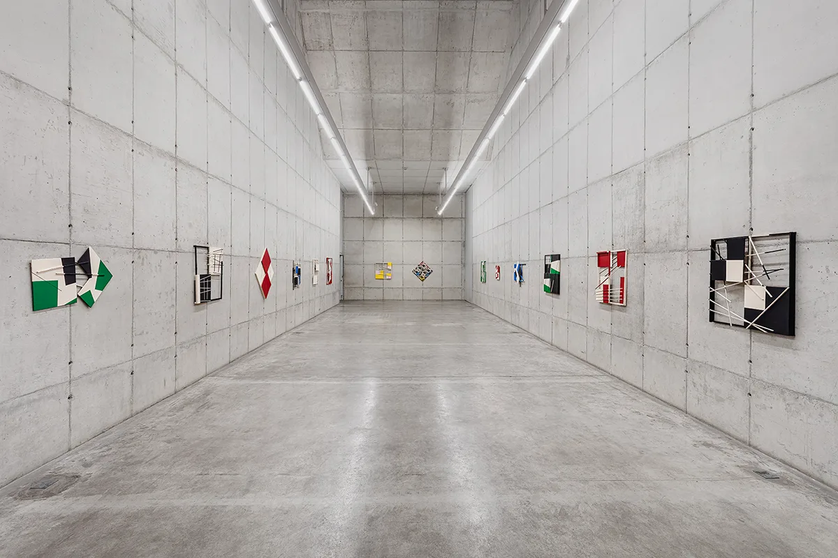 6- The plane of the canvas is crossed in several directions. In terms of drawing, we could say that it is crossed, or cut by lines. But they are much more than that: they are fine volumes of different extensions. Sticks? Yes, and more than that: they are minimal canvases, three-dimensional, that project themselves over and between the planes, while these, disposed at different levels, stand out in a field of installed force – and never broken – by the square.