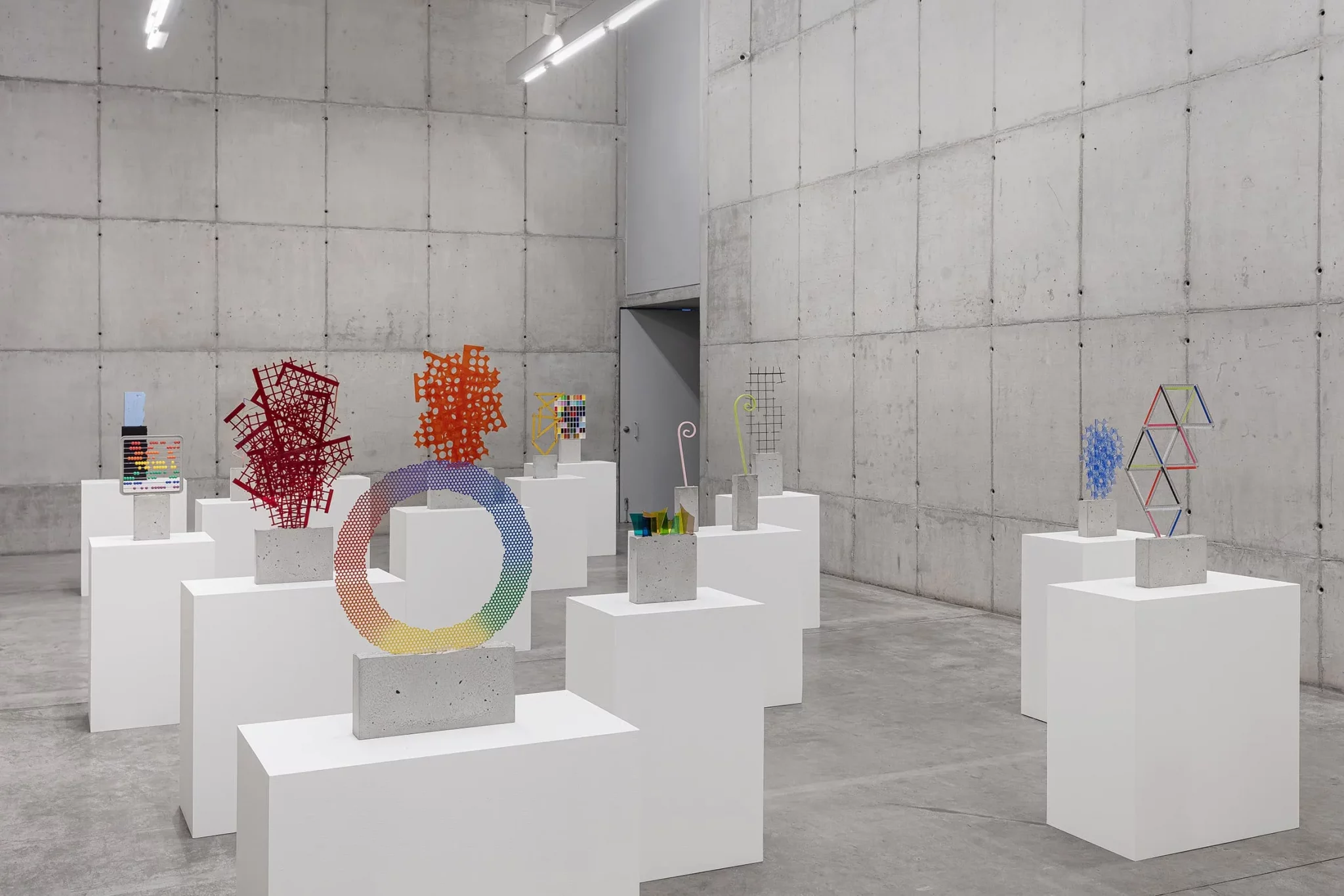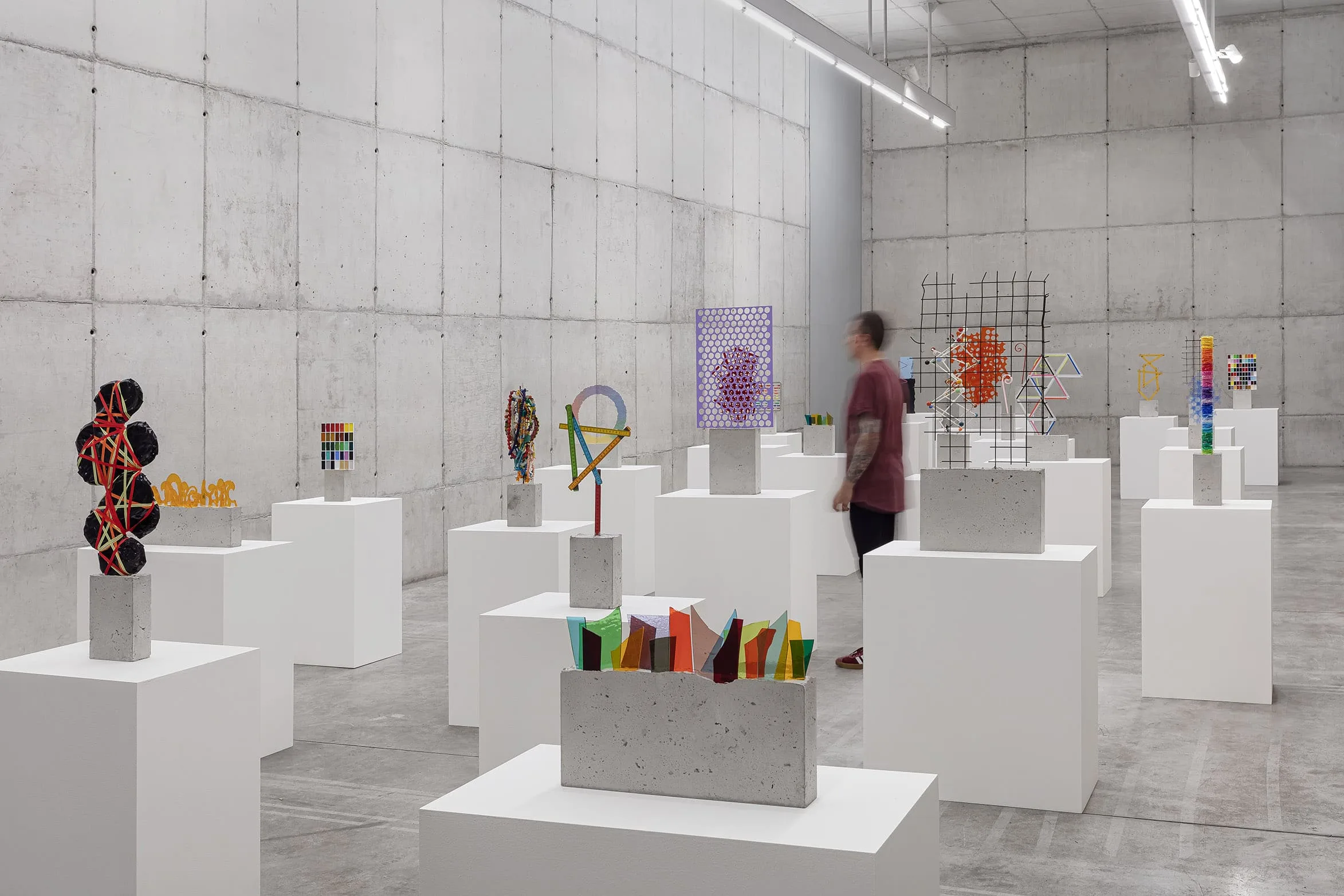Each free-standing Concreto is made up of a brightly coloured element set into a simple rectangular block of concrete. The first of these works, from 2012, was inspired by the shards of coloured glass embedded in concrete walls that are a feature of many urban settings. Since then Batchelor has incorporated a vast range of objects and materials into this basic form, from off-cuts of Plexiglas and commercial hardware, to paint tin lids and decorative coat hangers. They also vary widely in size, from a few centimetres high to over three metres tall.
