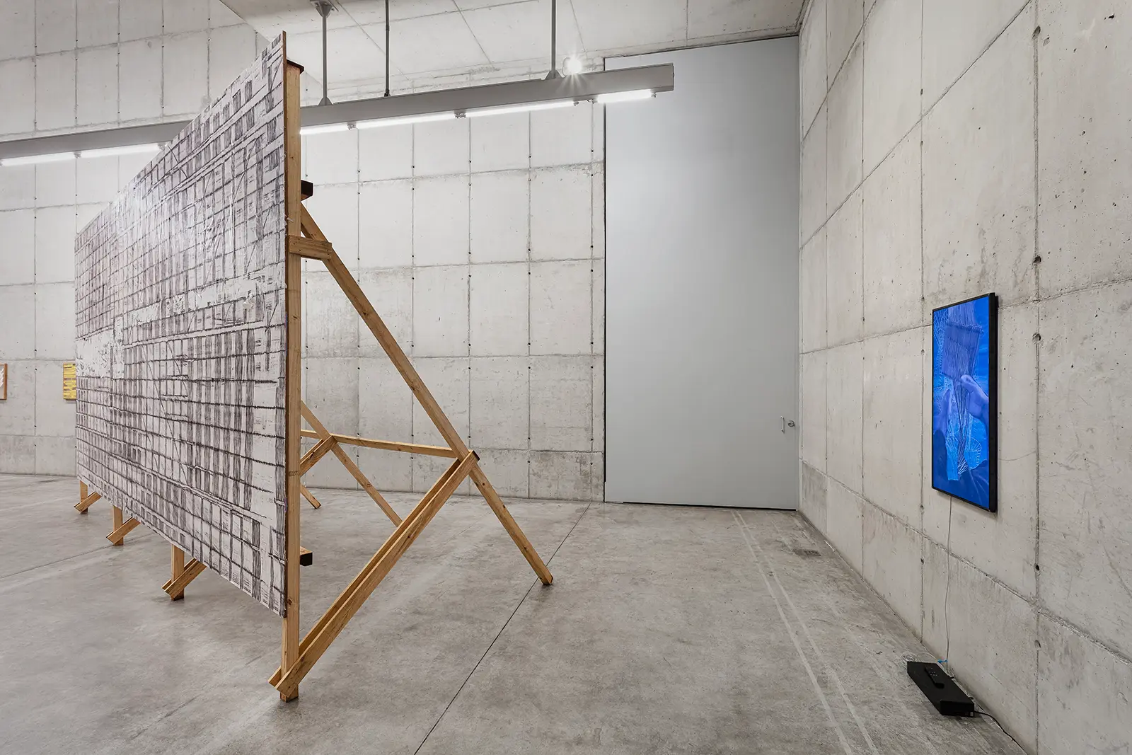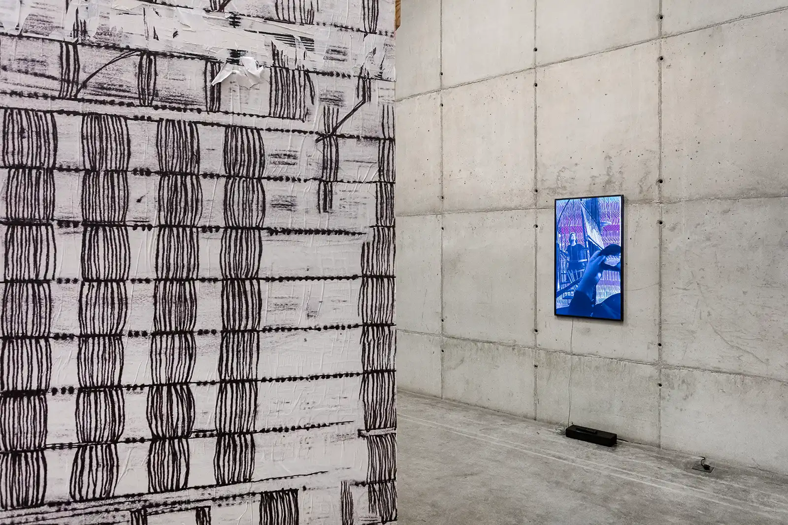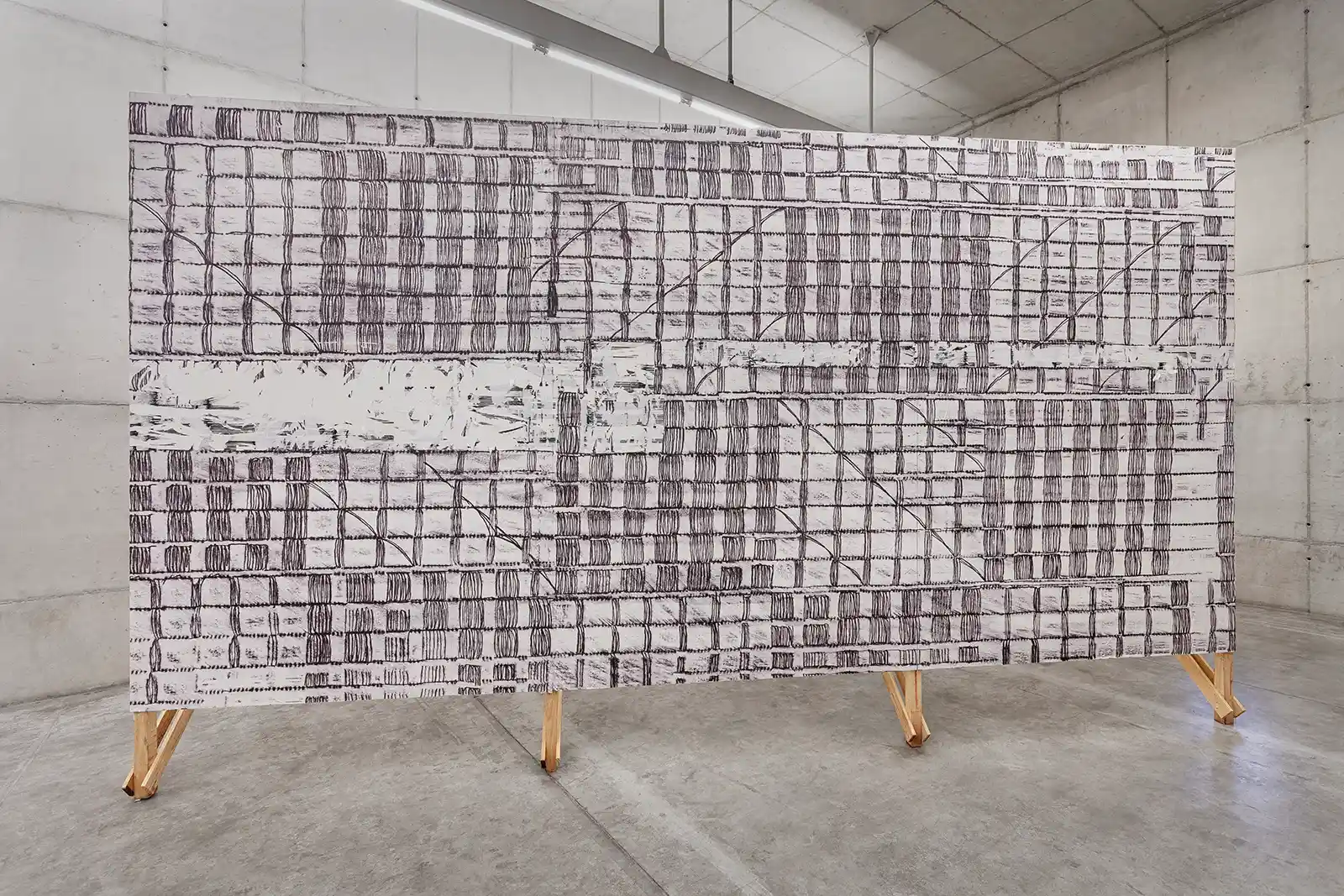 O procedimento de produção da animação Entre-linhas (2023) envolve o desenho, recortes, colagens sobre as imagens de vídeo capturado pela própria artista durante uma viagem ao noroeste argentino. Nele, as mãos de uma artesã entrelaçam fios e tramas no tear. Fragmentados em mais de 700 imagens, os frames do vídeo são impressos e um a um sofrem intervenções manuais da artista. Uma vez finalizadas, as imagens são escaneadas em camadas e reanimadas. O vídeo final apresenta interrupções, ruídos e colagens com reproduções e elementos de outras obras presentes nesta exposição, estabelecendo uma relação análoga ao próprio processo criativo de Mein, que recombina, esgarça tramas e técnicas e vira do avesso a própria linguagem.