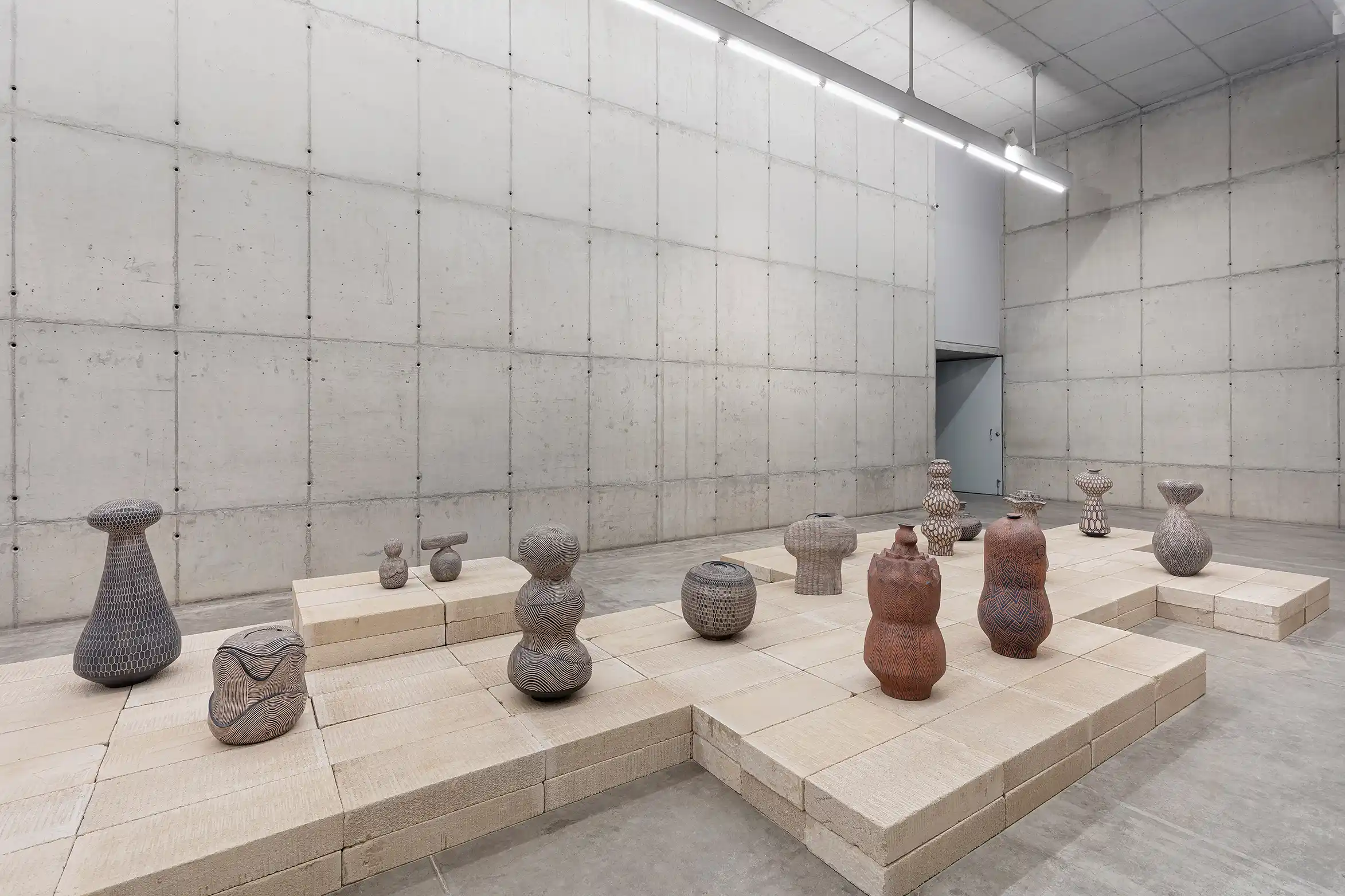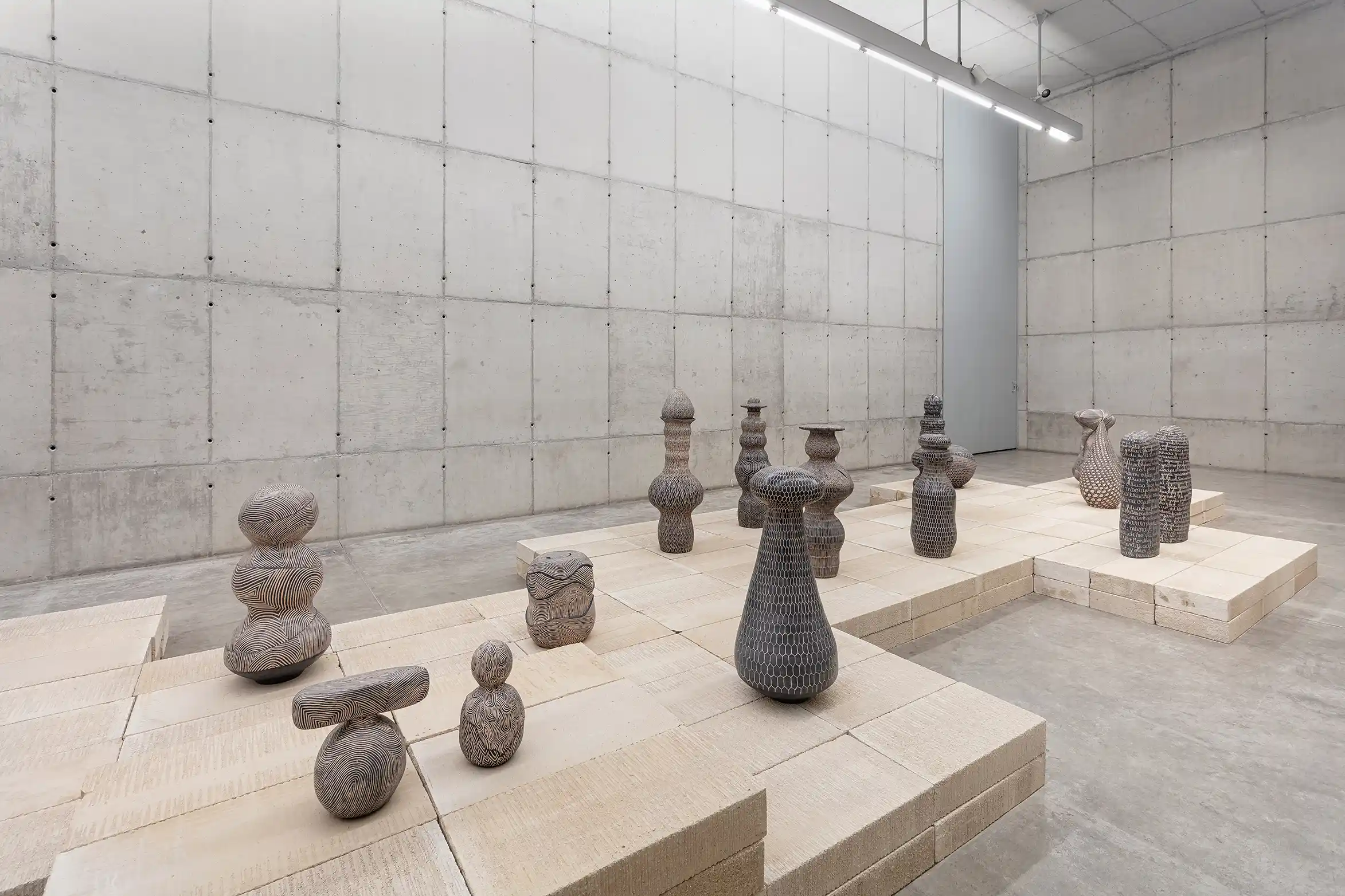O uso da técnica do esgrafiado, característica fulcral nas obras recentes de Enciso, também demanda um atento procedimento de vigilância. Enquanto grava as formas no corpo das peças, o artista minuciosamente tece tramas, cria linhas de tensão ou de fuga e estabelece um vocabulário visual que dribla um fácil aprisionamento do seu vernáculo escrito. Ora essas gravações lembram espécies de colmeias de abelhas – estabelecendo uma relação imagética com o fazer coletivo, qualidade fundamental para a prática da cerâmica de ascendência guarani, em que tudo é ensinado de maneira oral atravessando distintas gerações; ora trazem linhas posicionadas lado a lado, que com a sinuosidade da superfície das peças criam espécies de zonas de convergência visuais. Assim, dentro do universo do artista, a escultura em si se sustenta como uma espécie de corpo, enquanto a escrita se converte na pele, onde estão inscritos acontecimentos e marcas de individualização e diferenciação.